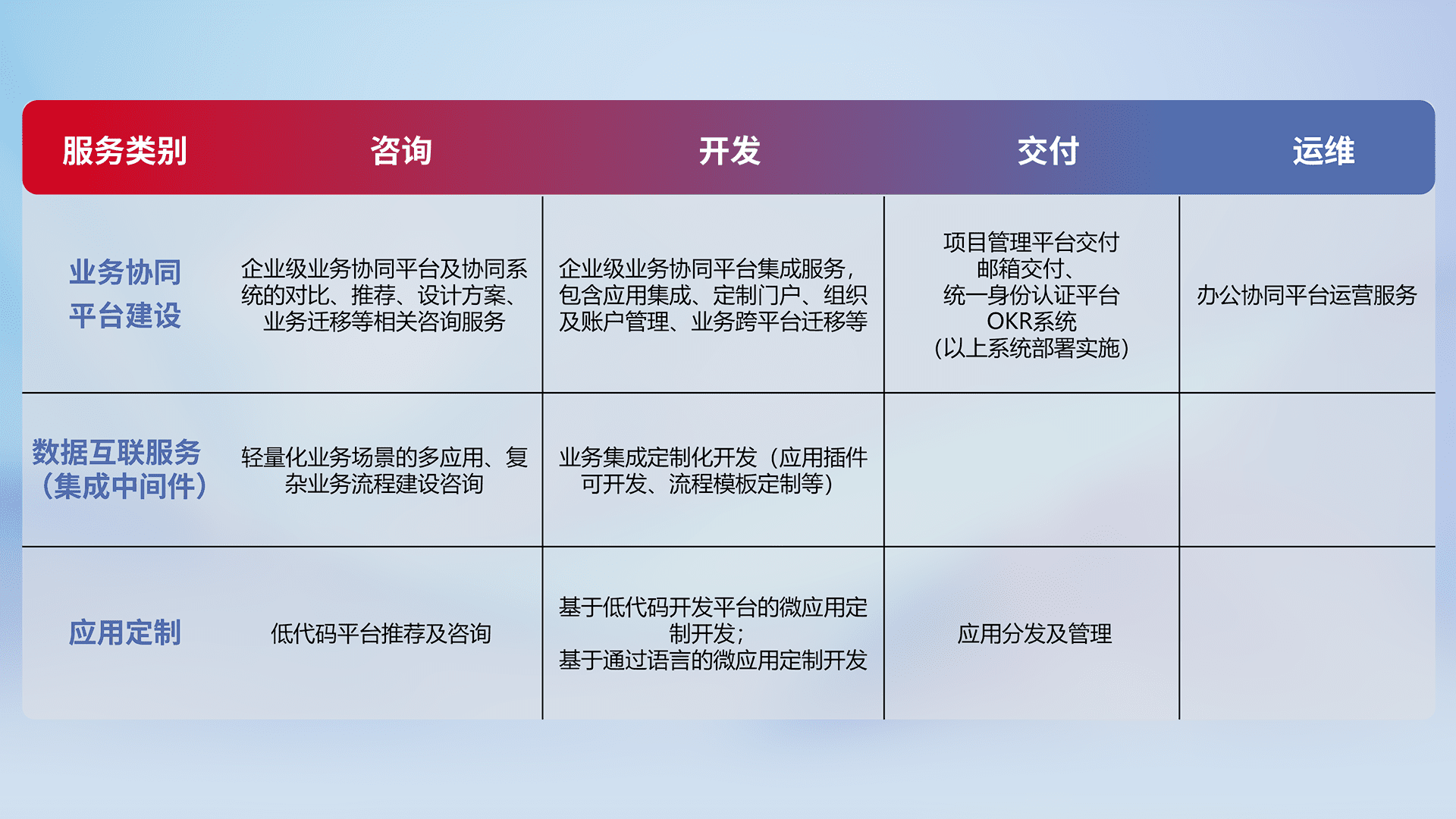 针对钉钉、、、企微、、、、IDaas等平台级产品提供产品的规划、、、方案、、交付、、定制化开发等服务,,实现如统一协同办公、、智能客户服务、、混合会议管理、、智能数据查询、、、等业务场景,,,,实现数字化转型。。。。