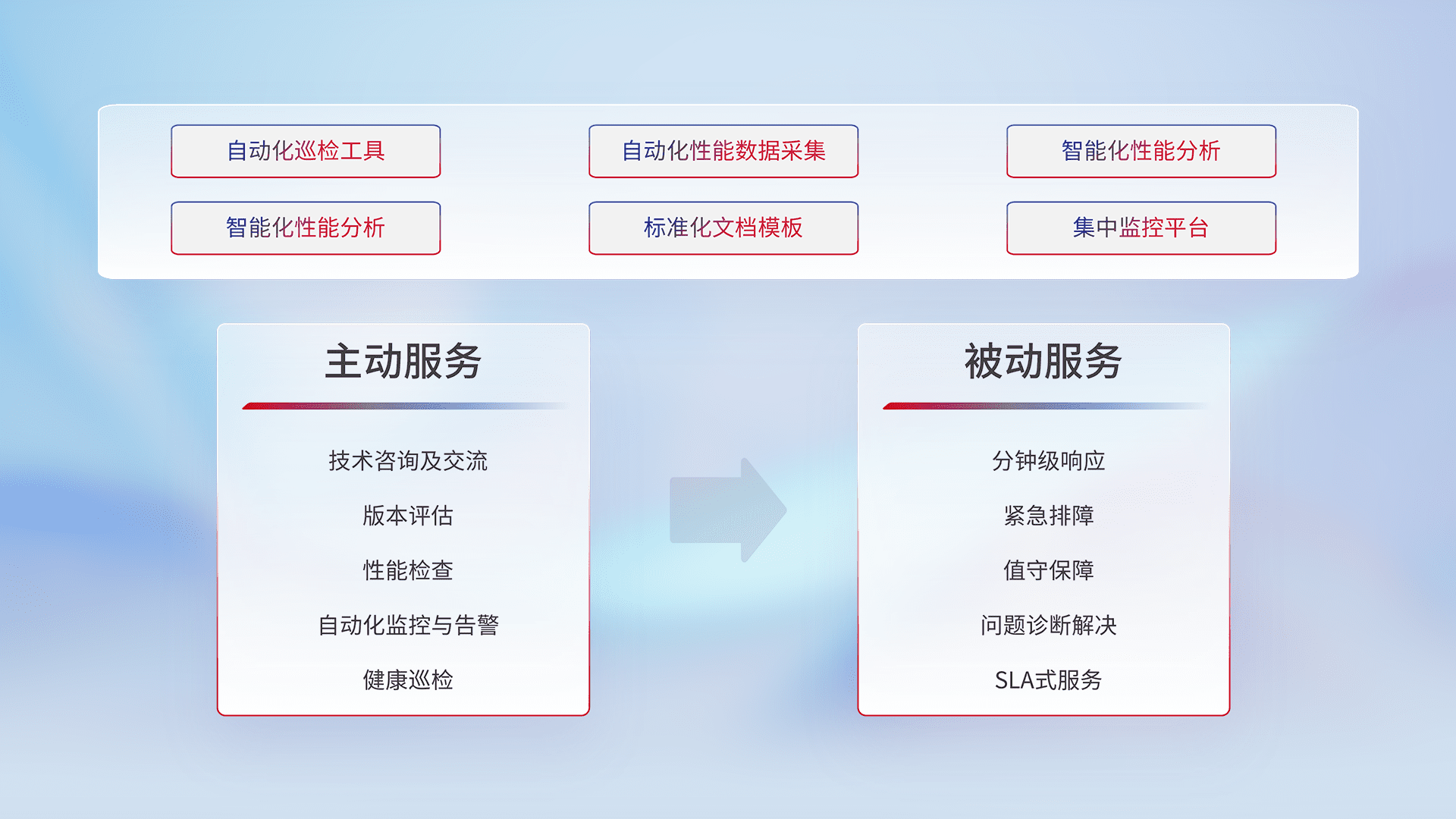 智能化工具和标准化文档,,保障服务质量,,提供主动服务(包含技术咨询、、、、版本评估、、、、性能检查、、、自动化监控与告警、、健康巡检)和被动服务包含(分钟级响应、、、、紧急排障、、、值守保障、、、、问题诊断解决、、SLA服务)。。。。