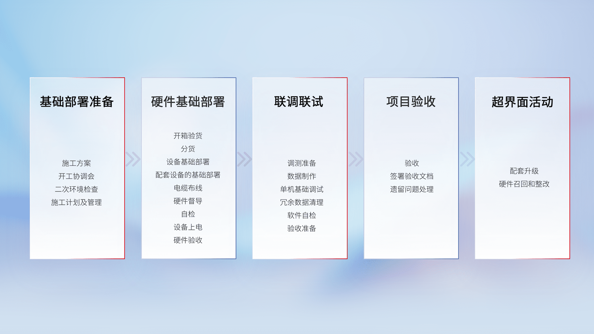 从基础部署准备、、硬件基础部署、、联调联试、、、项目验收、、越界面活动的全过程可追溯,,,保证施工质量和进度。。。